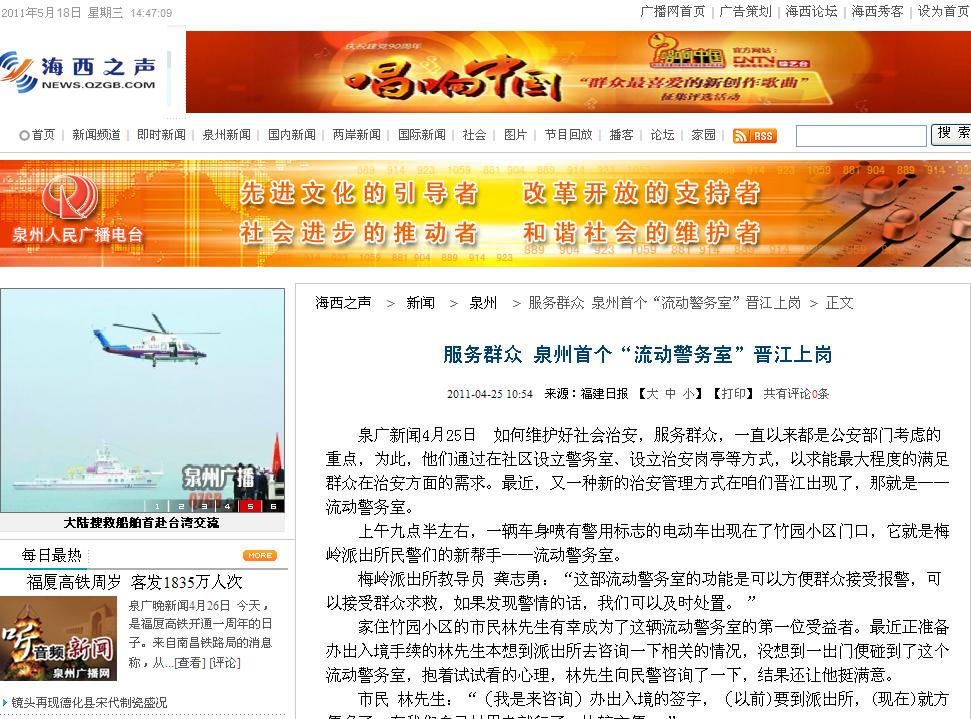 海西之聲報(bào)道:晉江流動(dòng)警務(wù)室