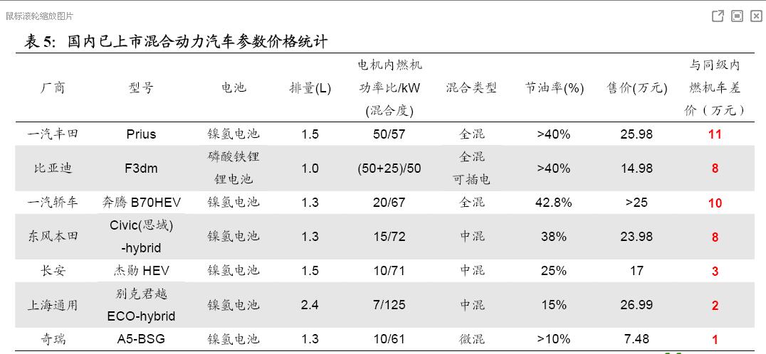 國(guó)內(nèi)已上市混合動(dòng)力汽車參數(shù)價(jià)格統(tǒng)計(jì)。