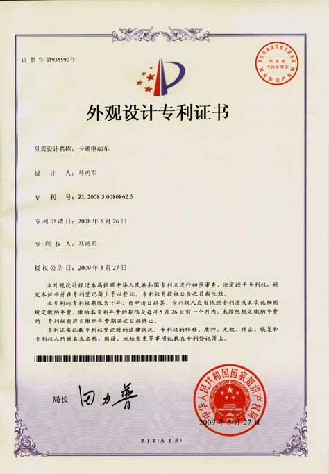 鴻馬電動(dòng)汽車公司生產(chǎn)的卡通電動(dòng)車,外觀設(shè)計(jì)已獲專利,本外觀設(shè)計(jì)巾幗中華人民共和國(guó)國(guó)家知識(shí)產(chǎn)權(quán)局依照中華人民共和國(guó)專利法進(jìn)行初步審查,決定授予專利權(quán),頒發(fā)外觀設(shè)計(jì)專利證書并在專利登記簿上予以登記。